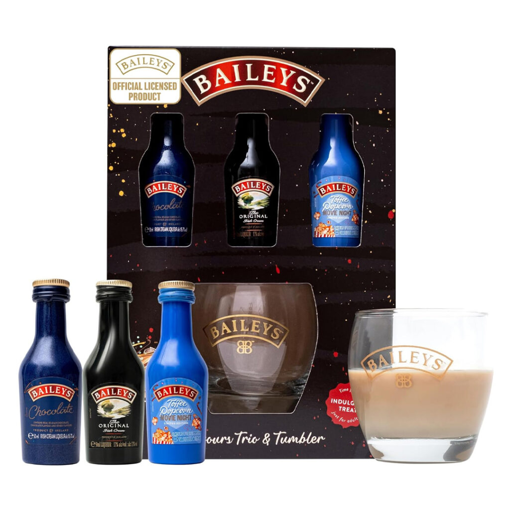 Baileys Gift Set – 3 Mini Bottles, Chocolate, Toffee Popcorn & Glass