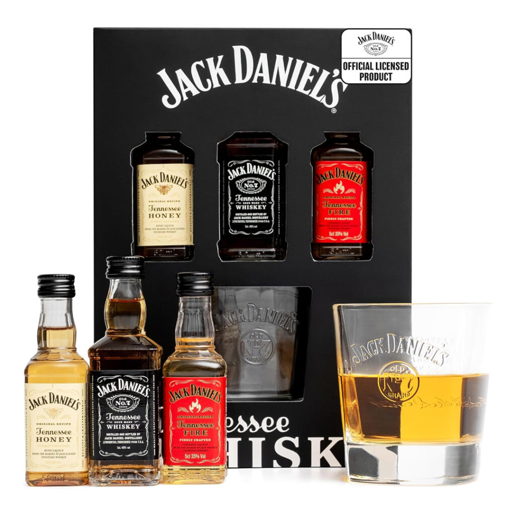 Jack Daniels Gift Set – 3 Mini Bottles & Whiskey Glass