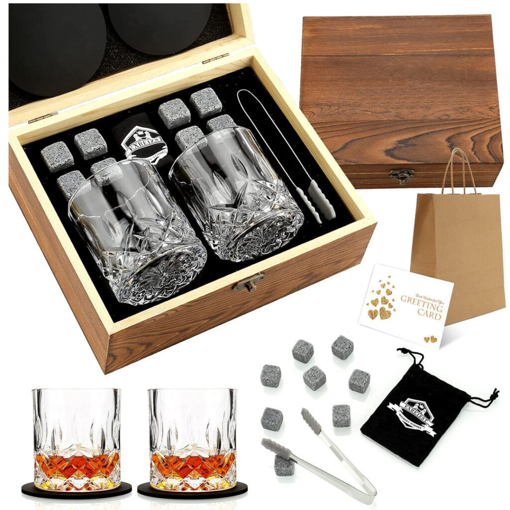 Whiskey Stones & Glasses Gift Set – Wooden Box with 2 Glasses