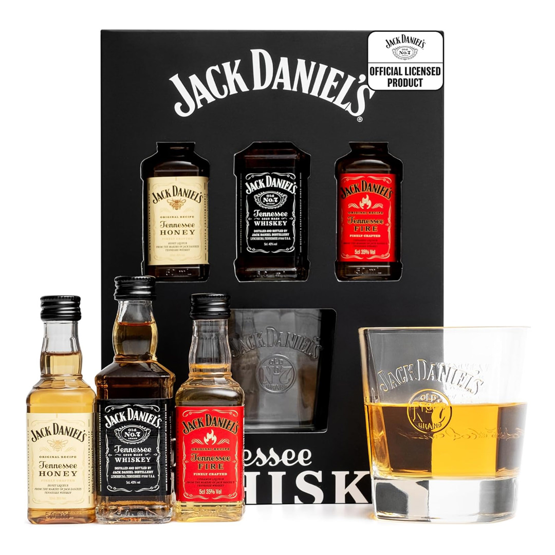 WHISKY CHRISTMAS GIFTS FOR MEN: Our official mini Whisky gift set includes a Jack Daniels Tumbler; holds 330ml, the perfect partner for your miniature alcohol bottles of Jack Daniels Whiskey. Enjoy Jack Daniels single malt whisky favourites in our miniature whiskey sets; Honey Jack Daniels Whiskey 35% ABV, Jack Daniels Tennesse Fire 35% ABV and Old No7 Tennessee whiskey 40% ABV