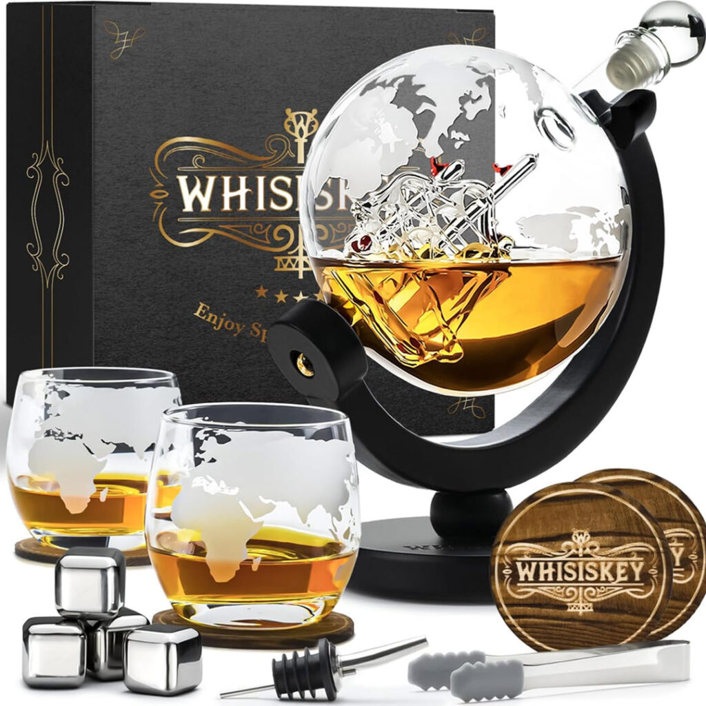 WHISISKEY 900ml Globe Whiskey Decanter Set – Includes 2 Glasses & 4 Stones