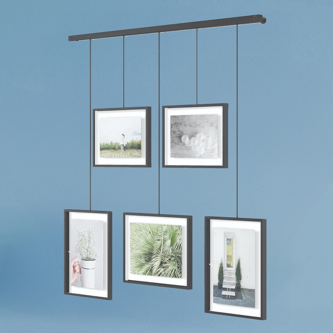 MULTI-PHOTO WALL DISPLAY: Display your favorite photos in an eye-catching fashion using these five hanging, gallery-style frames suspended from a modern and sleek beam; features two 4×6 and three 5×7 picture frames (please remove brown protection cardboard prior to inserting photos)